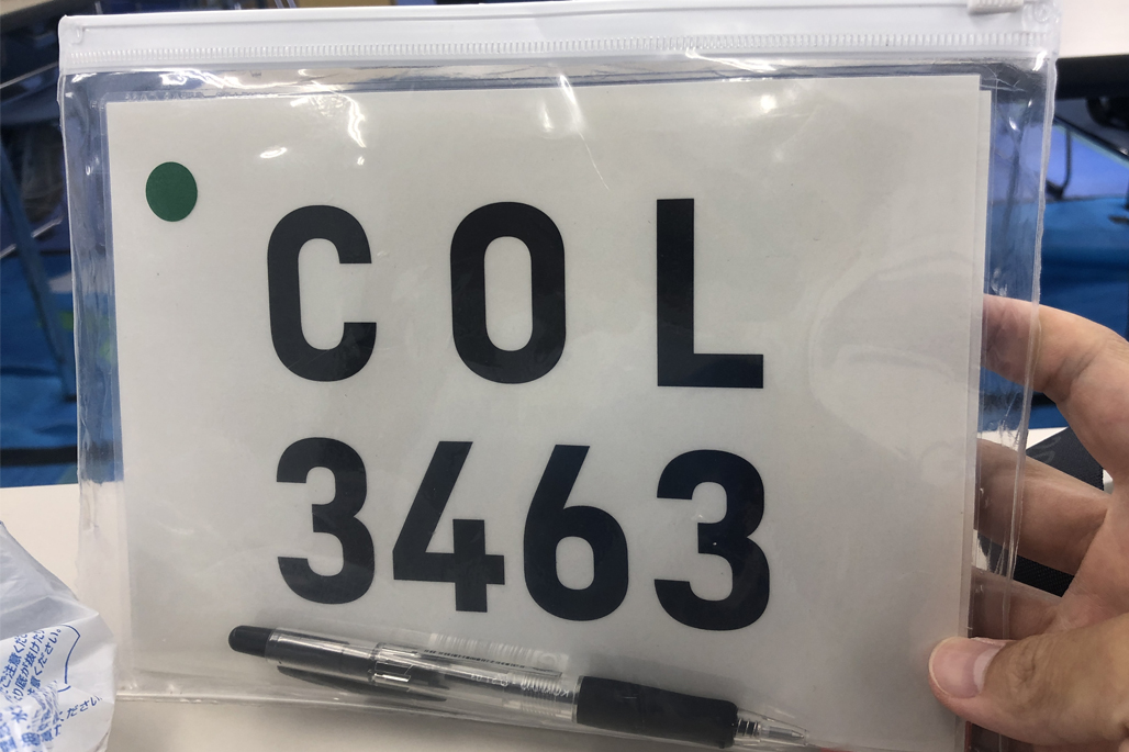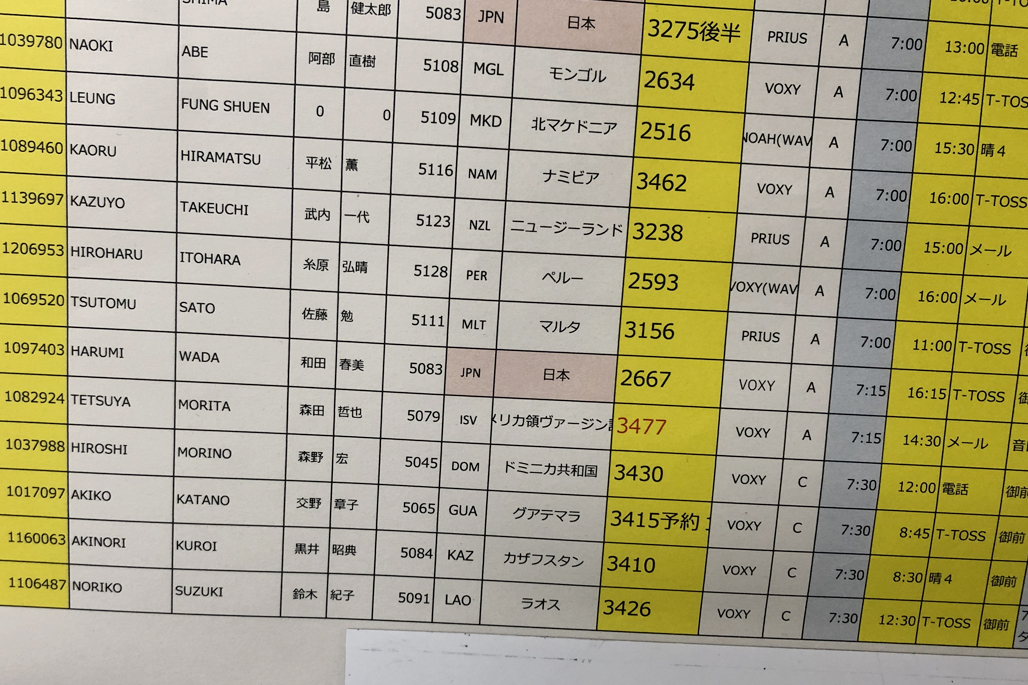 予定通りチェックインが出来ると、1日のスケジュール確認後、全身用の汗拭きシートや補給用タブレットなど熱中症対策のアイテムを受け取り、国名札、専用スマホ、給油カードが入ったジップロックを渡され、待機所で連中が現れるまで待機します。